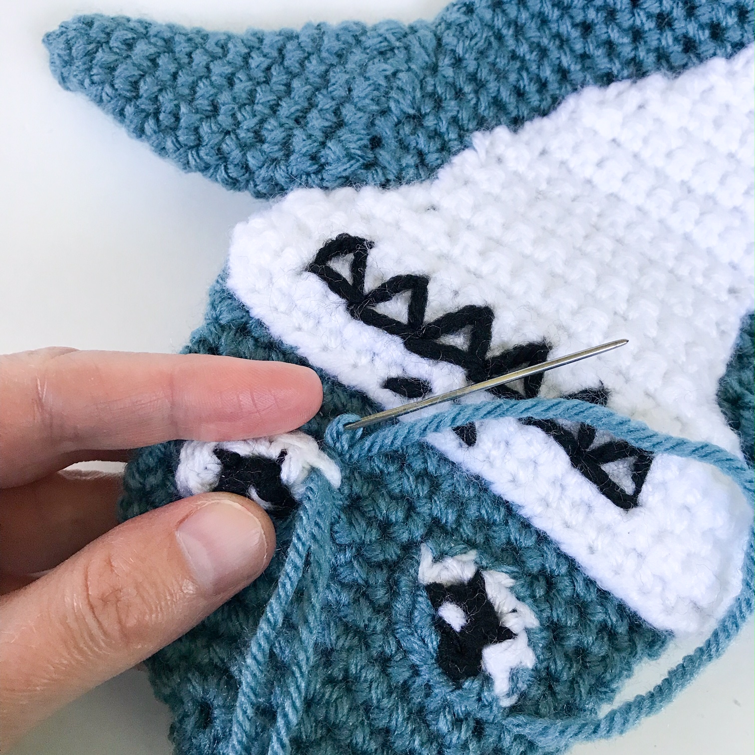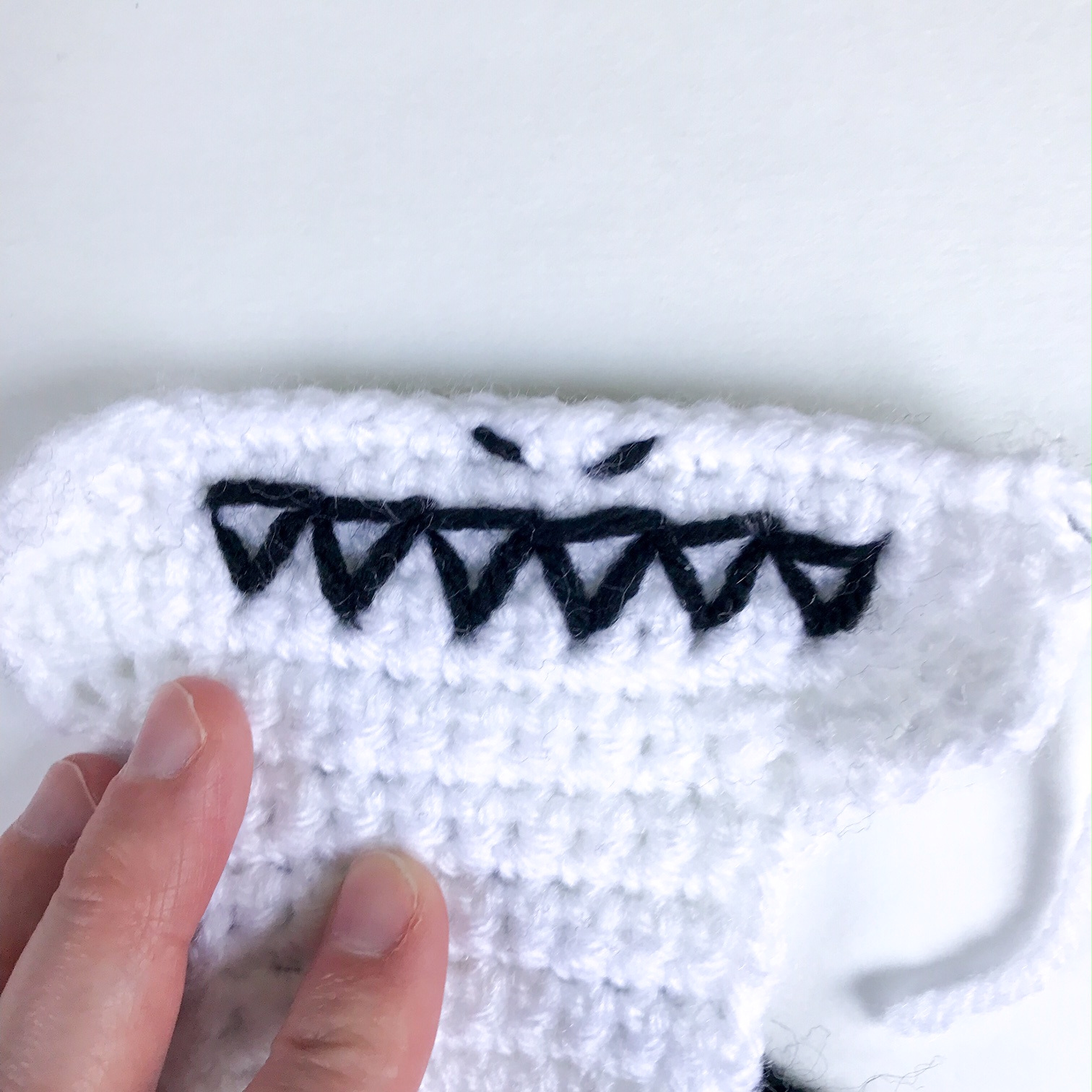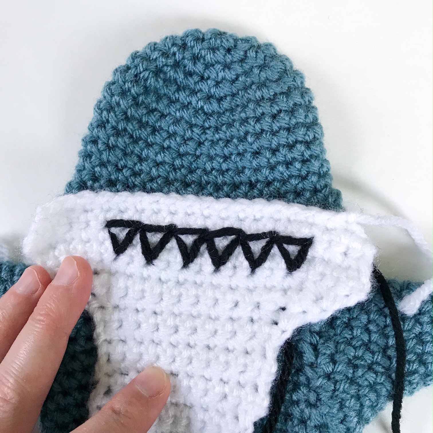 Using black yarn, stitch the Vs of the teeth into the face, about 2 rnds down from the top, and 3 sts from each side. Use pictures for more details. Also sew the nostrils centered above the teeth. Knot black yarn behind the face. Sew the white down to the body with the widest part on the lower part of the head, and the narrow part down to the bottom of the puppet, off toward the back fin.