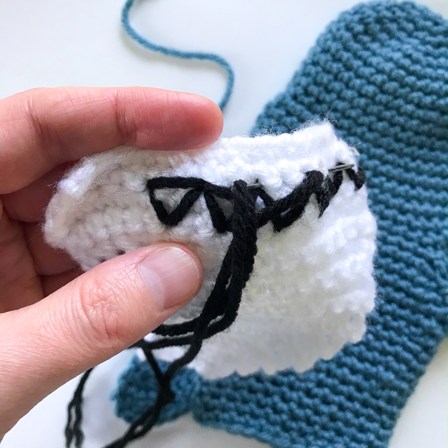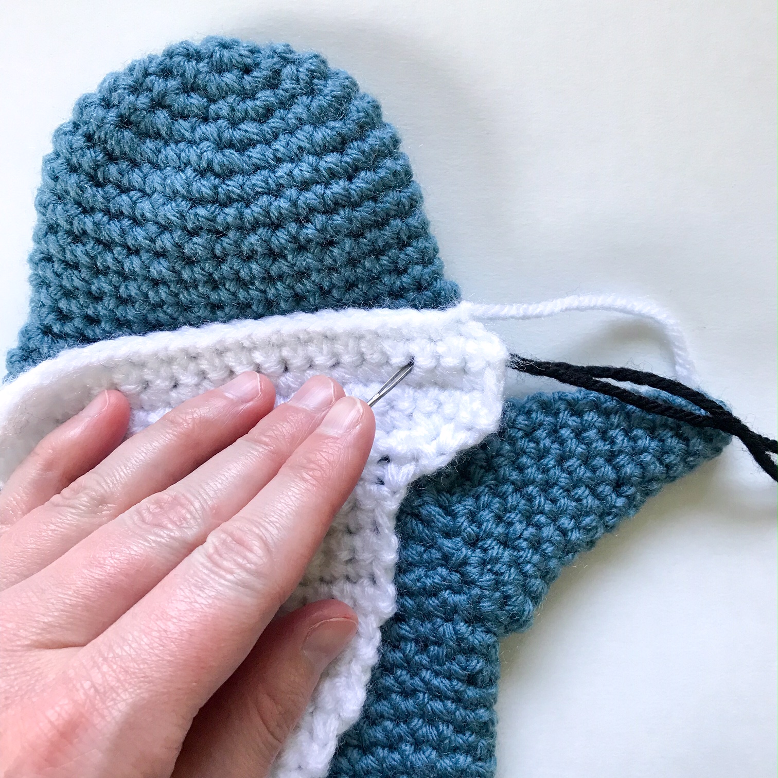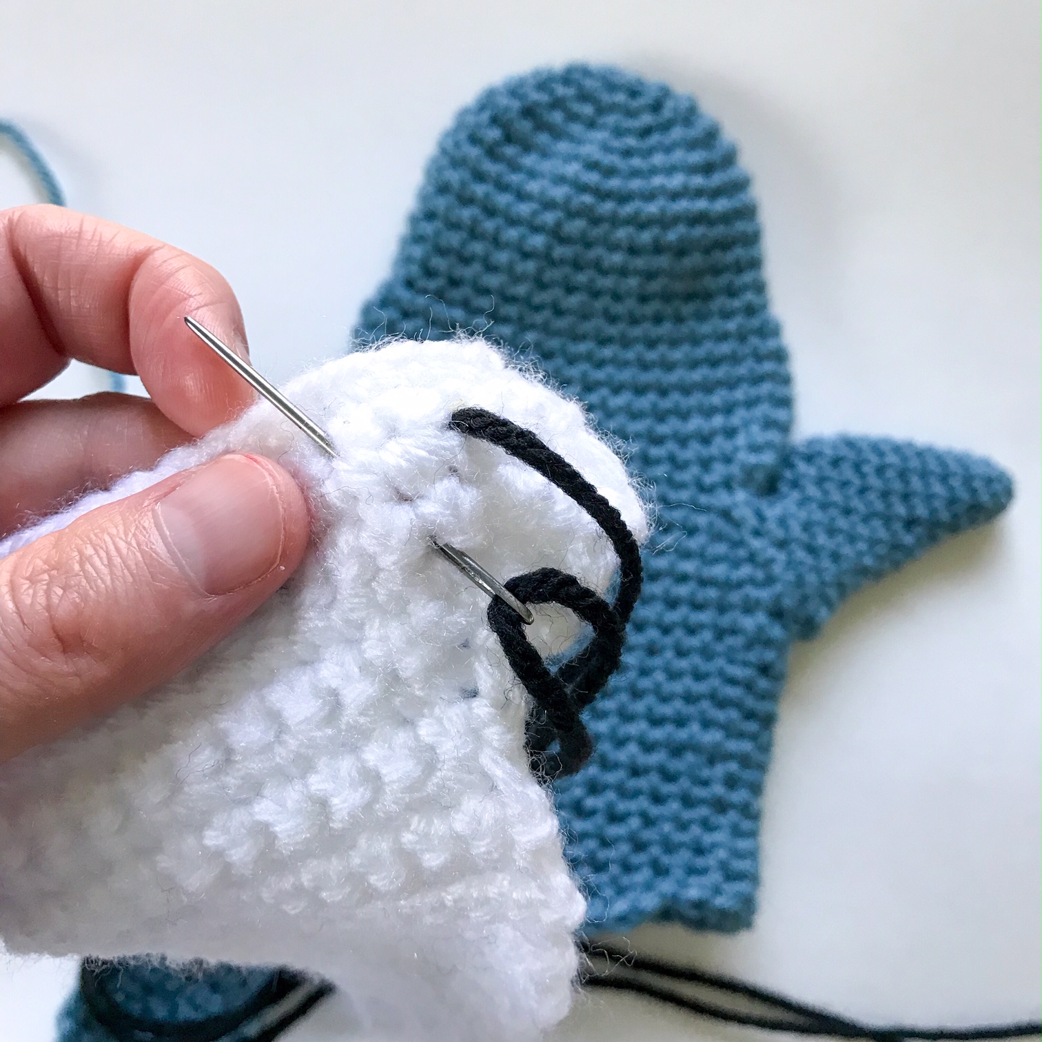 Using black yarn, stitch the Vs of the teeth into the face, about 2 rnds down from the top, and 3 sts from each side. Use pictures for more details. Also sew the nostrils centered above the teeth. Knot black yarn behind the face. Sew the white down to the body with the widest part on the lower part of the head, and the narrow part down to the bottom of the puppet, off toward the back fin.