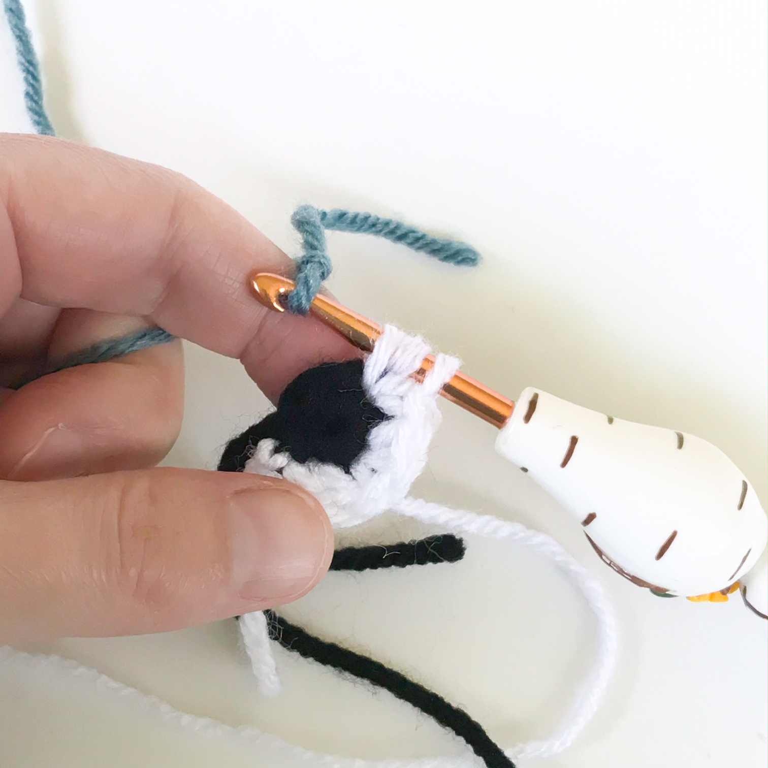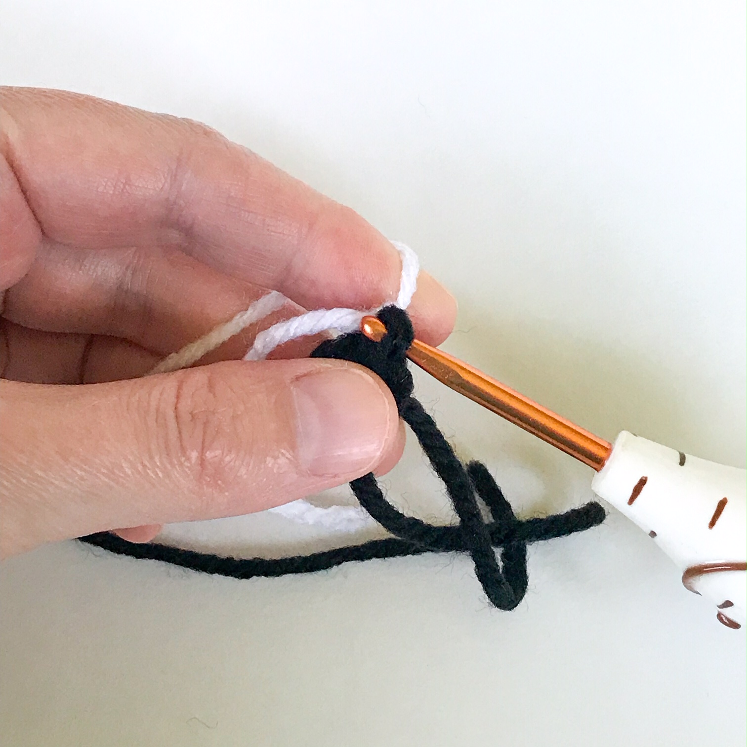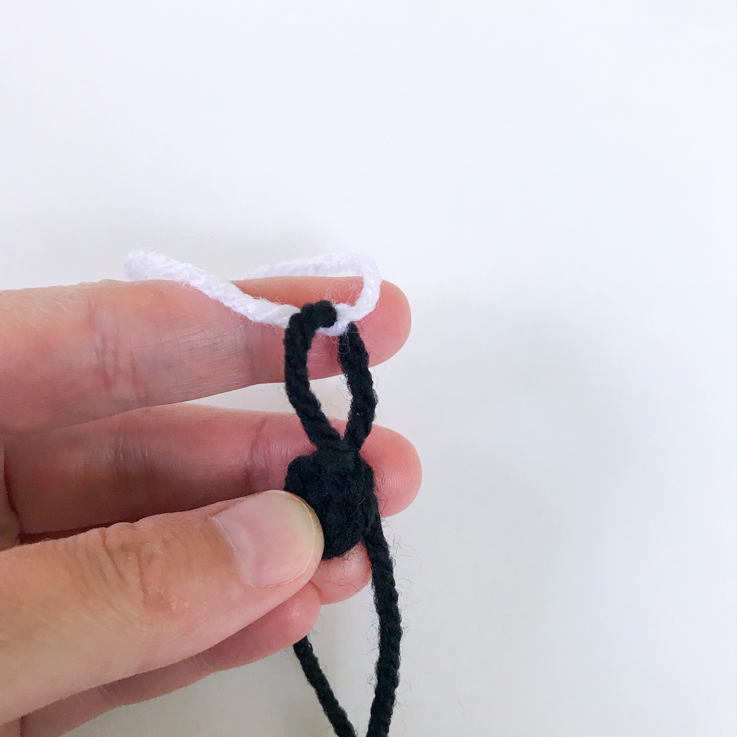 *Note: To change to white here, follow the pictures below. Once you have done the sl st in black, pull the loop up. Tie the white into that loop and slide the white knot down the back side of that black loop. Put hook back into the black loop and pull tightly around the hook. Then ch 1 with the white yarn, and fasten off the black. Continue in white.