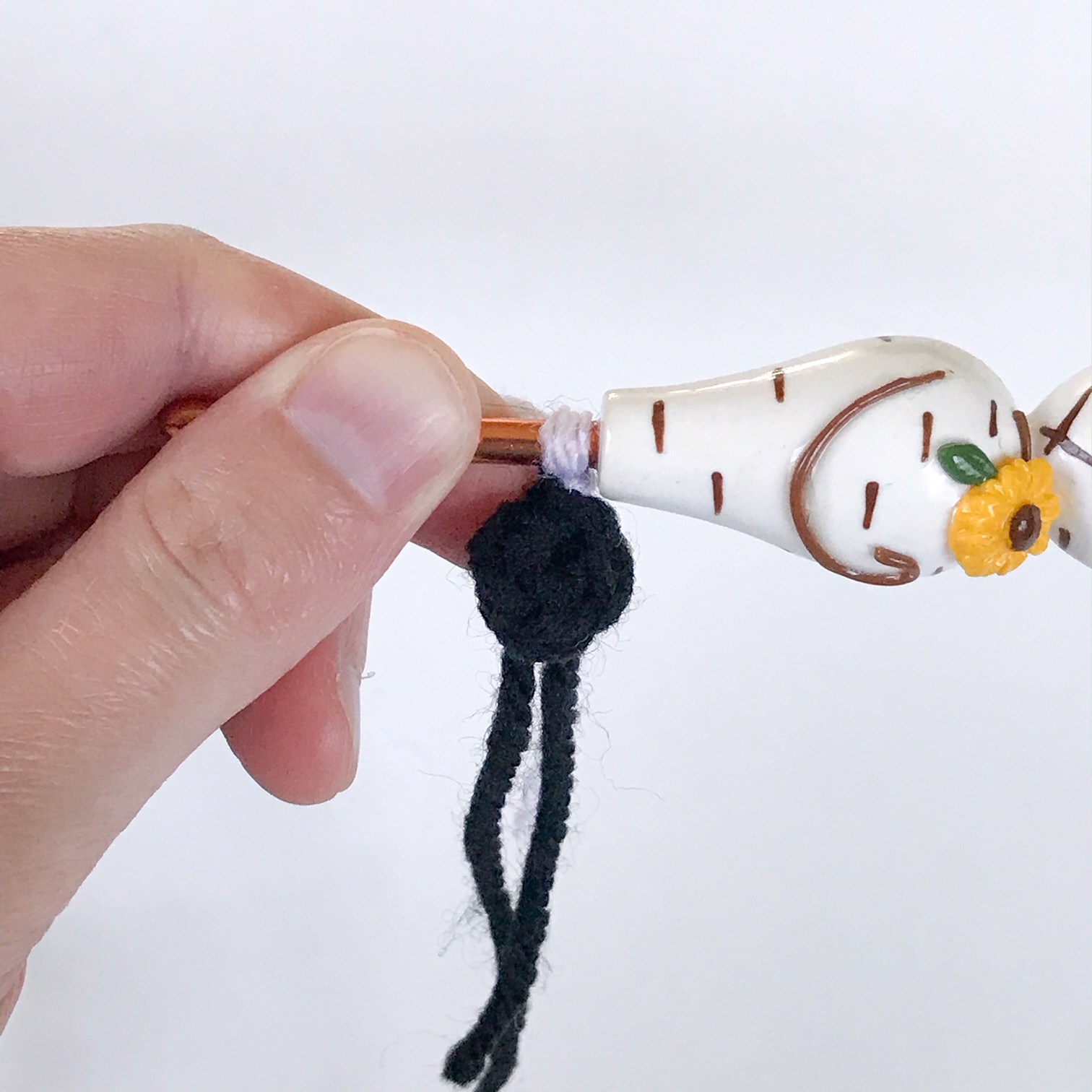 Fasten off, leaving a long tail for sewing. Sew onto the top center of the head, with the front of it right on rnd 1 and the back going down the back side of the head.