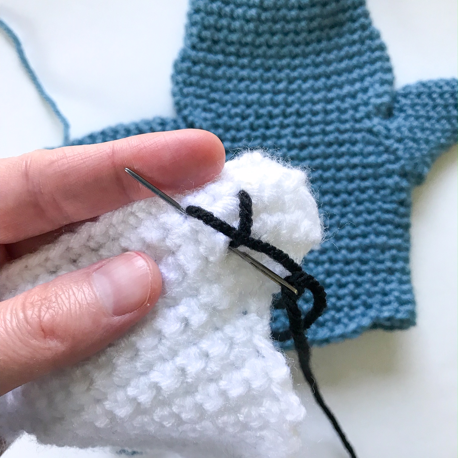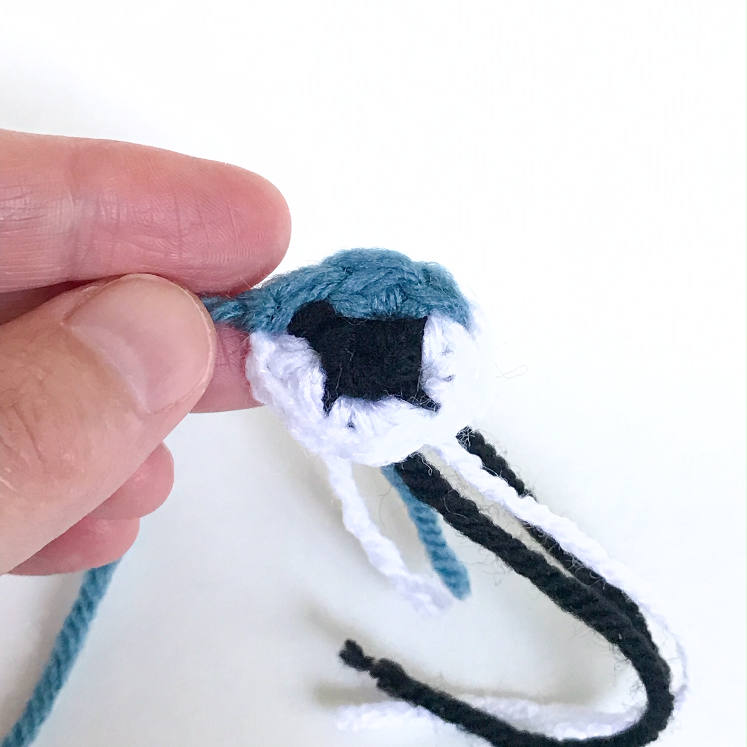Fasten off, leaving a long tail for sewing. Use one of the white tails to sew a fleck in the eye, and knot off all but the blue in the back and trim. These will puff the eyes out a bit without any stuffing. Position the eyes at a slant, about 2 sts apart, 2 rnds up from the white of the face, and 2 sts from the sides. Sew the eyes in place using the long blue tail, going TWICE around each st. Knot off and weave in ends.