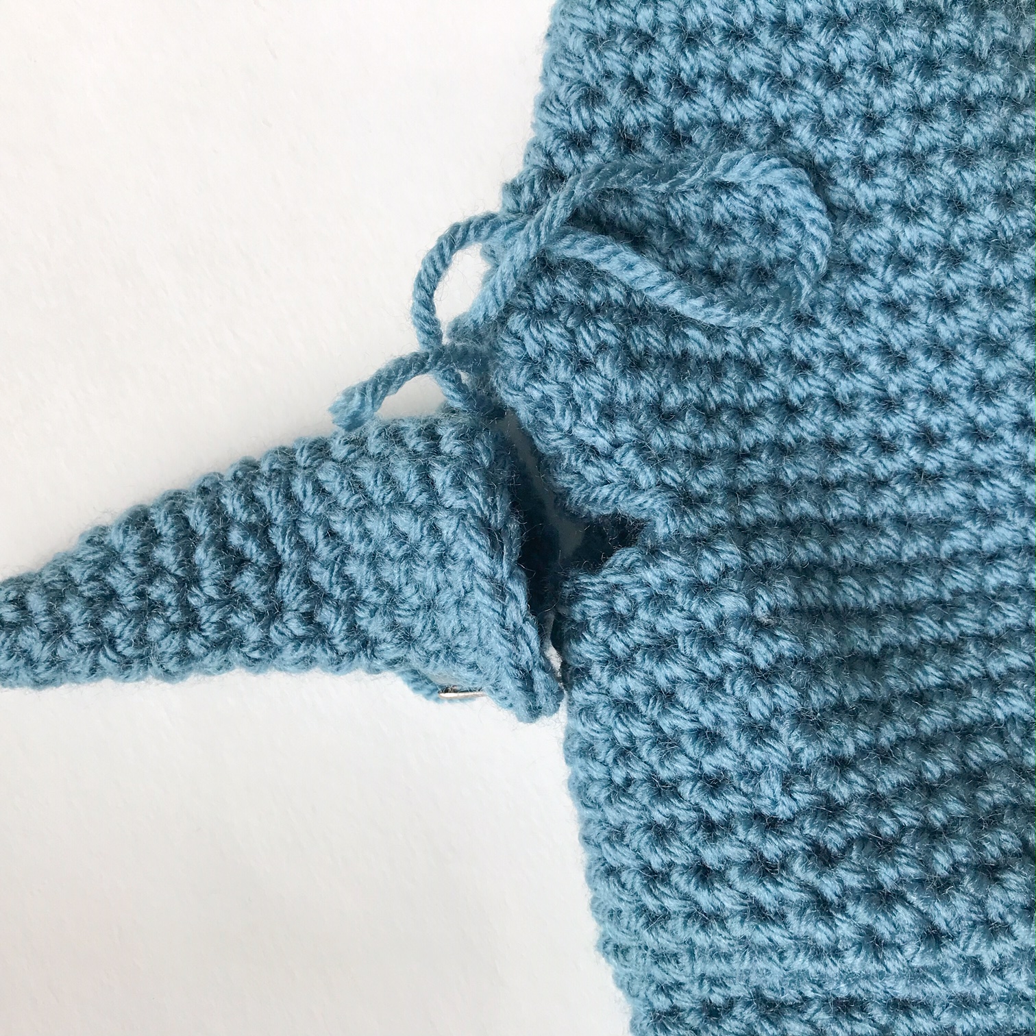 Fasten off, leaving a long tail for sewing. Sew the arm over the hole, sewing the bottom (where your increases are) to the 5th rnd beneath the arm, and up, and then sewing the top of the arm to the top of the arm hole, then down the other side again. This will allow the hole to still provide a place for the finger, while also keeping that triangular shape of the side fin.